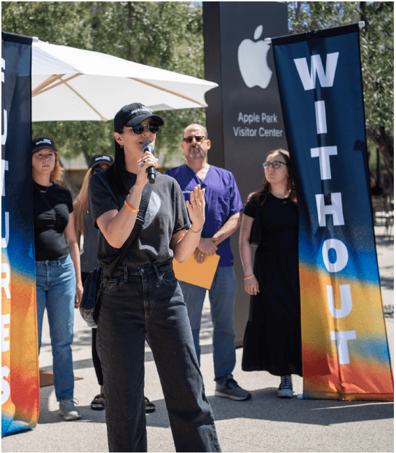 We sent the message by flying a plane over Apple’s Cupertino headquarters, deploying a fleet of mobile billboards, surrounding prominent Apple Stores with wild postings, and running a full page advertisement in the New York Times.